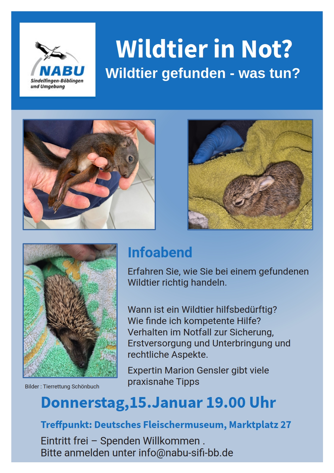 Datum Jan. 15 2026 Uhrzeit 19:00 – 20:00 Wildtier gefunden – was tun? Vortrag Teile diese Veranstaltung + Zu Google Kalender hinzufügen + iCal / Outlook exportieren 00 Tage 00 Stunden 00 Minuten 00 Sekunden